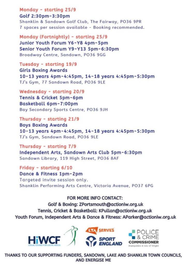Please see FREE fun activities for young people living or educated in the Bay area (Sandown, Lake and Shanklin) ages 10- 18 years (ages specified for some sessions) coordinated by Community Action Isle Of Wight’s Bay area, Youth Project team.